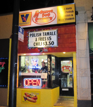 Beef Polish with mustard, neon green relish, chopped onions & sport peppers.